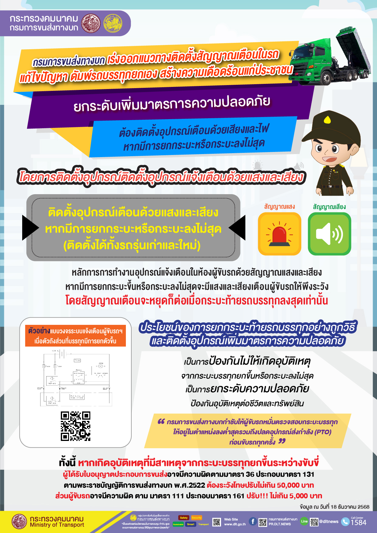 นายสรพงศ์ ไพฑูรย์พงษ์ อธิบดีกรมการขนส่งทางบก (ขบ.) ระบุว่า ตามที่มีเหตุการณ์ วันที่ 18 ธันวาคม 2568 รถบรรทุกยกเท (รถดัมพ์) กระบะยกขึ้นและชนเข้ากับสะพานลอยคนข้ามถล่มลงมาทับหัวเก๋งรถบรรทุกและรถกระบะ บนถนนเทพรัตน (บางนา-ตราด) ทำให้มีผู้เสียชีวิตและบาดเจ็บ กรมการขนส่งทางบก เร่งออกแนวทางยกระดับมาตรการความปลอดภัยโดยกำหนดให้บริษัทผู้ผลิตรถ อู่ต่อตัวถังรถ ผู้ประกอบการขนส่งสินค้าและเจ้าของรถบรรทุกยกเท (รถดัมพ์) ต้องติดตั้งอุปกรณ์เตือนผู้ขับรถด้วยสัญญาณเสียงและไฟ หากมีการยกกระบะขึ้นหรือกระบะลงไม่สุด โดยจะให้มีผลบังคับใช้โดยเร็วทั้งกับรถใหม่และรถที่จดทะเบียนอยู่แล้ว โดยหลักการการทำงานอุปกรณ์แจ้งเตือนในห้องผู้ขับรถด้วยสัญญาณแสงและเสียงหากมีการยกกระบะขึ้นหรือกระบะลงไม่สุดก็จะมีแสงและเสียงเตือนผู้ขับรถทำให้ผู้ขับพึงระวังและสัญญาณเตือนจะหยุดก็ต่อเมื่อกระบะท้ายรถบรรทุกลงสุดเท่านั้น