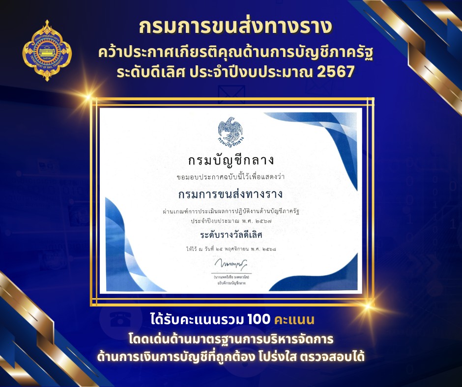 รางวัลที่ได้รับในครั้งนี้ สะท้อนถึงความมุ่งมั่นของกรมการขนส่งทางรางในการพัฒนาระบบบริหารจัดการให้เป็นไปตามกฎหมาย ระเบียบ และมาตรฐานทางการบัญชี พร้อมยกระดับการทำงานให้มีประสิทธิภาพยิ่งขึ้น ทั้งนี้ ขร. ยังคงยึดมั่นในการปฏิบัติงานด้วยความถูกต้อง โปร่งใส รับผิดชอบ และเกิดประสิทธิผลอย่างยั่งยืน เพื่อเป็นหน่วยงานต้นแบบในการบริหารภาครัฐ และตอบสนองต่อความต้องการของประชาชนและประเทศชาติต่อไปอย่างมั่นคง