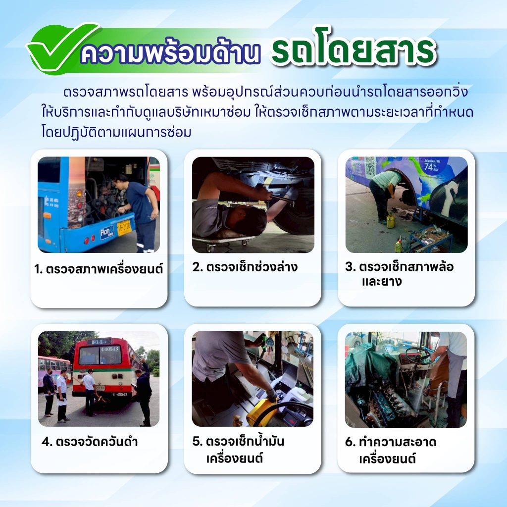 • ตรวจสอบสภาพรถโดยสารและอุปกรณ์ส่วนควบก่อนนำรถออกให้บริการ โดยเน้นการตรวจสภาพเครื่องยนต์ ระบบช่วงล่าง ล้อและยาง ระบบน้ำมันเครื่อง รวมถึงการตรวจวัดควันดำ และการทำความสะอาดเครื่องยนต์ เพื่อให้รถโดยสารอยู่ในสภาพสมบูรณ์และพร้อมใช้งาน
