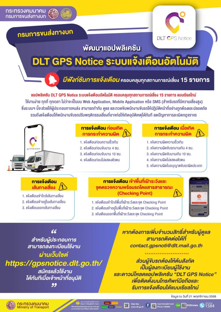 โดยกรมฯ ได้พัฒนาแอปพลิเคชัน DLT GPS Notice ระบบแจ้งเตือนอัตโนมัติ ครอบคลุมทุกสถานการณ์เสี่ยง 15 รายการ แบบเรียลไทม์ ใช้งานง่าย ทุกที่ ทุกเวลา ไม่ว่าจะเป็นบน Web Application, Mobile Application หรือ SMS (สำหรับรถที่มีความเสี่ยงสูง) ซึ่งระบบฯ นี้ จะช่วยให้ผู้ประกอบการขนส่งสามารถกำกับ ดูแล และกวดขันพนักงานขับรถให้ปฏิบัติหน้าที่อย่างถูกต้องและปลอดภัยรวมถึงแจ้งเตือนให้พนักงานขับรถปรับพฤติกรรมเสี่ยงที่อาจก่อให้เกิดอุบัติเหตุได้ทันที ลดปัญหาการละเมิดกฎจราจร