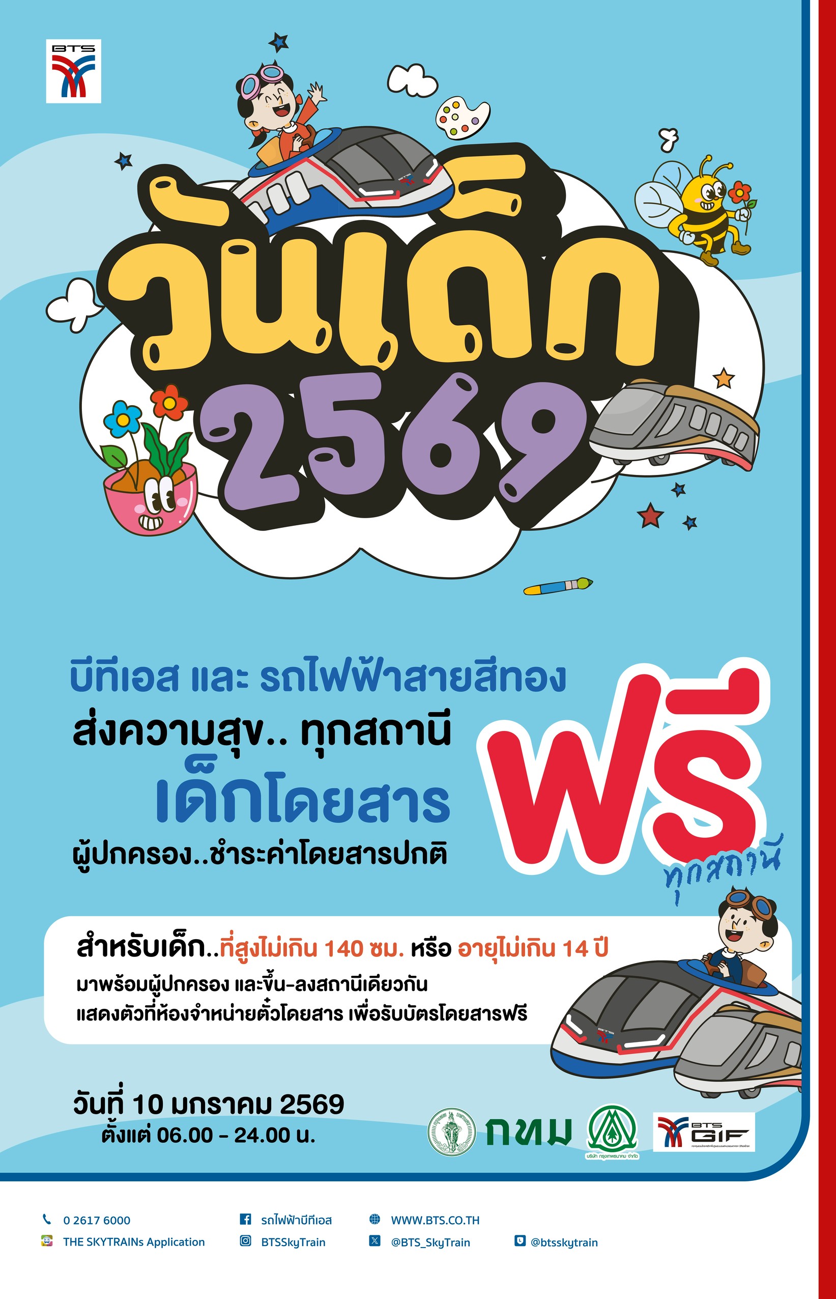 โดยเด็ก 1 คน ต่อบัตรโดยสาร 1 ใบ ส่วนผู้ปกครองชำระค่าโดยสารปกติ ในวันเสาร์ที่ 10 มกราคม 2569 ตั้งแต่เวลา 06.00 น. ถึง 24.00 น. เพื่อให้เด็กและเยาวชนทุกคน ซึ่งเป็นอนาคตของชาติ ได้เดินทางไปท่องเที่ยวสถานที่ต่าง ๆ ตามแนวรถไฟฟ้าบีทีเอส และรถไฟฟ้าสายสีทอง พร้อมกับครอบครัว ได้อย่างสะดวกสบาย นอกจากนี้ บริษัทฯ ได้จัดเจ้าหน้าที่คอยดูแลอำนวยความสะดวกให้กับเด็ก และผู้ปกครอง เดินทางได้อย่างปลอดภัย โดยสามารถติดต่อขอรับบัตรโดยสารเดินทางฟรี ได้ทุกสถานีที่ห้องจำหน่ายตั๋วโดยสาร