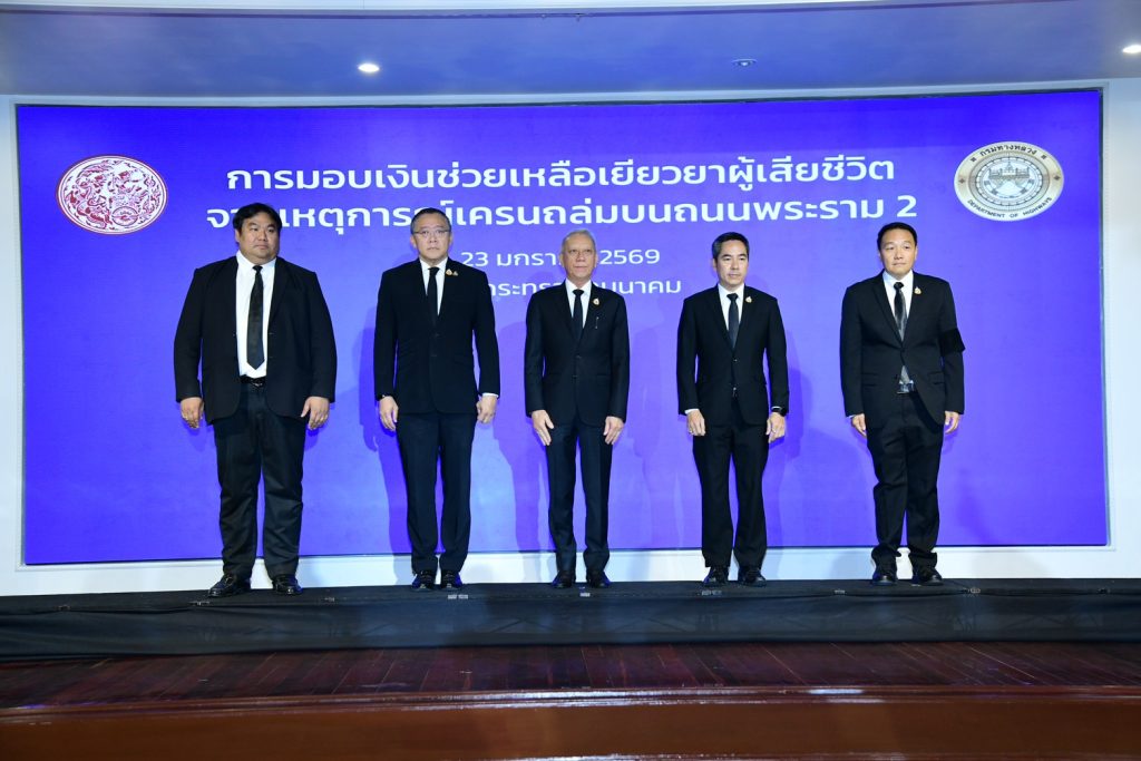 วันนี้ (23 มกราคม 2569) เมื่อเวลา 08.30 น. ณ หอประชุมราชรถสโมสร กระทรวงคมนาคม นายพิพัฒน์ รัชกิจประการ รองนายกรัฐมนตรีและรัฐมนตรีว่าการกระทรวงคมนาคม ให้เกียรติเป็นประธานสักขีพยานในพิธีมอบเงินเยียวยาแก่ครอบครัวผู้เสียชีวิตจากเหตุการณ์คานปูนและเครนก่อสร้างโครงการทางหลวงพิเศษหมายเลข 82 (M82) สายทางยกระดับบางขุนเทียน – บ้านแพ้ว ช่วงเอกชัย – บ้านแพ้ว ตอน 7 จังหวัดสมุทรสาคร พังถล่ม