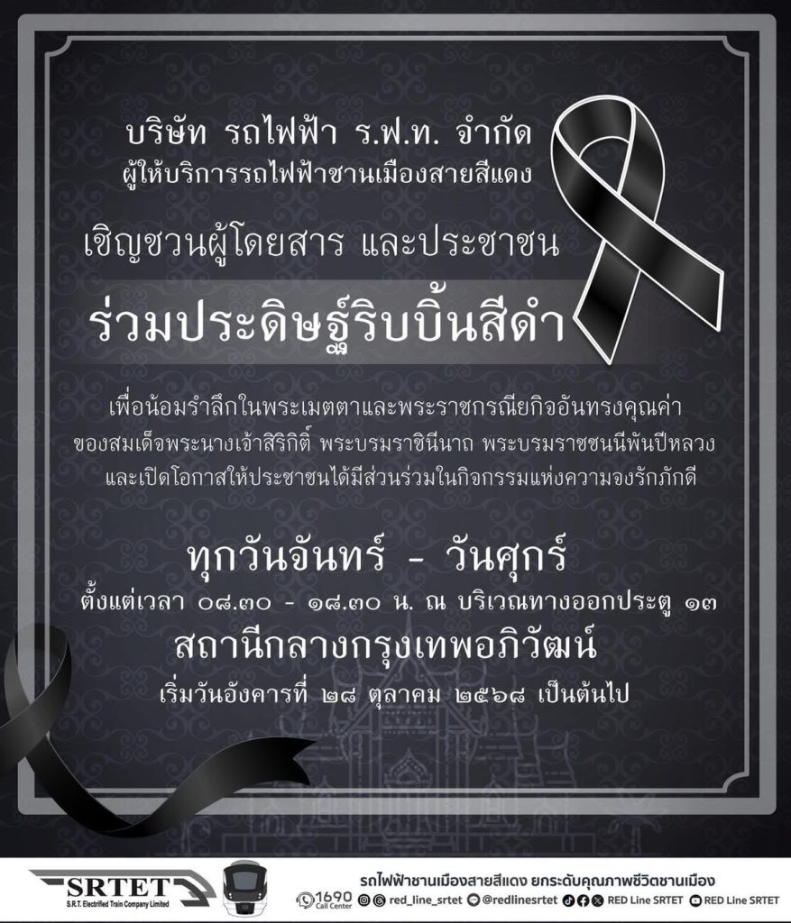 ในโอกาสนี้จึงขอเชิญชวนผู้โดยสาร และประชาชนทั่วไป ร่วมประดิษฐ์ริบบิ้นสีดำ เพื่อแสดงออกถึงความจงรักภักดี น้อมรำลึกในพระเมตตาและพระราชกรณียกิจอันทรงคุณค่า ของสมเด็จพระนางเจ้าสิริกิติ์ พระบรมราชินีนาถ พระบรมราชชนนีพันปีหลวง โดยสามารถเข้าร่วมประดิษฐ์ริบบิ้นสีดำ ได้ทุกวันจันทร์ – วันศุกร์ เริ่มวันอังคารที่ 28 ตุลาคม 2568 เป็นต้นไป ตั้งแต่เวลา 08.30 – 18.30 น. ณ บริเวณทางออกประตู 13 สถานีกลางกรุงเทพอภิวัฒน์