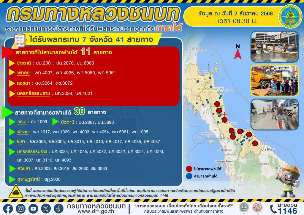 ทั้งนี้ ปัจจุบัน (2 ธันวาคม 2568) มีโครงข่ายทางหลวงชนบทได้รับผลกระทบจากอุทกภัยใน 7 จังหวัด ได้แก่ ปัตตานี พัทลุง สงขลา นครศรีธรรมราช ยะลา กระบี่ และสุราษฎร์ธานี ได้รับผลกระทบรวม 41 สายทาง แบ่งเป็น สัญจรผ่านได้ 30 สายทาง และไม่สามารถสัญจรผ่านได้ 11 สายทาง