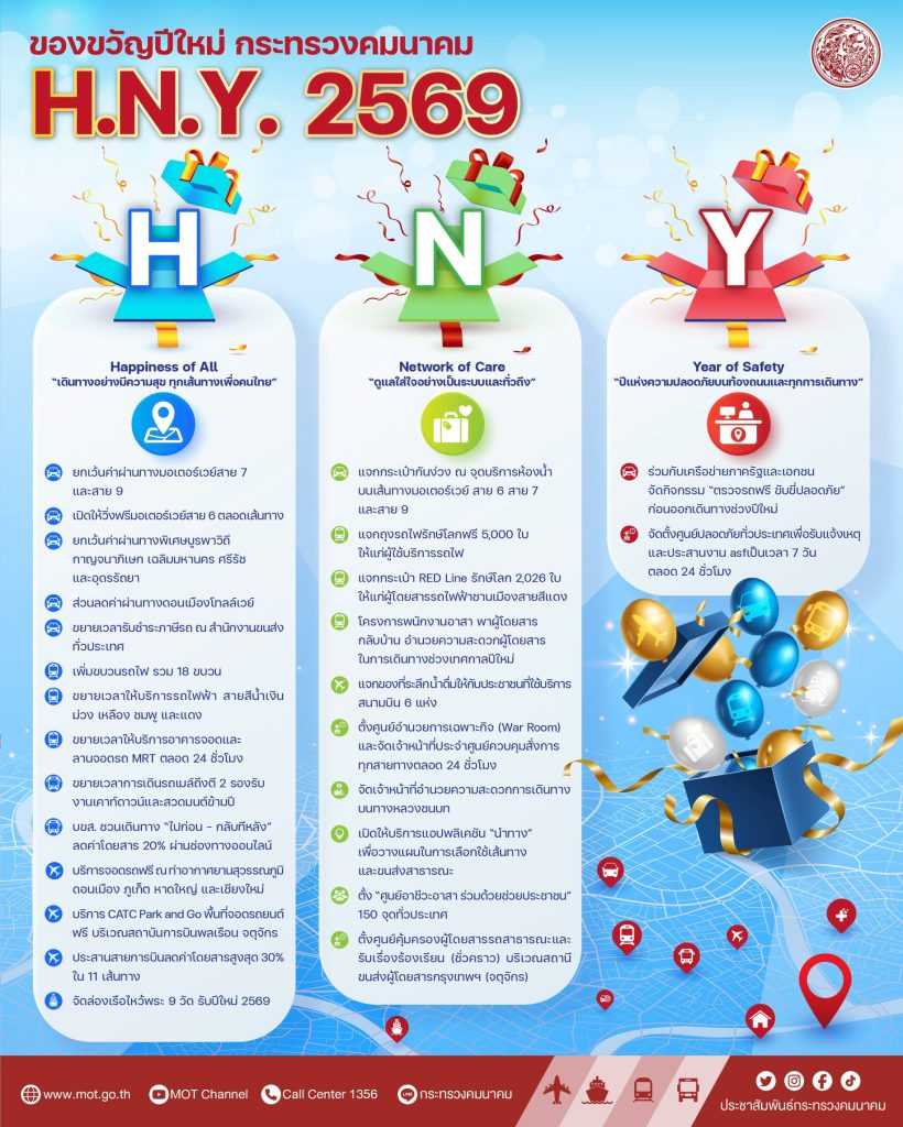 วันนี้ (10 ธันวาคม 2568) นายพิพัฒน์ รัชกิจประการ รองนายกรัฐมนตรีและรัฐมนตรีว่าการกระทรวงคมนาคม ระบุว่า ที่ประชุมคณะรัฐมนตรี (ครม.) มีมติรับทราบ “ของขวัญปีใหม่ 2569” จากกระทรวงคมนาคม ภายใต้แนวคิด “H.N.Y 2569 – Happiness of All, Network of Care, Year of Safety” โดยมี นางสาวมัลลิกา จิระพันธุ์วาณิช รัฐมนตรีช่วยว่าการกระทรวงคมนาคม นายชยธรรม์ พรหมศร ปลัดกระทรวงคมนาคม และผู้บริหารทุกหน่วยงานร่วมกันจัดมาตรการ ลดค่าใช้จ่าย เพิ่มทางเลือกการเดินทาง และมอบของที่ระลึกแทนคำขอบคุณประชาชนที่ใช้บริการระบบคมนาคมของรัฐตลอดทั้งปี