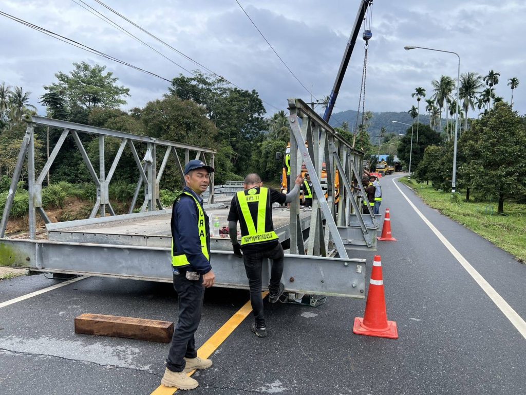 นอกจากนี้ ทช. ยังได้ระดมกำลังเจ้าหน้าที่เร่งทำการติดตั้งสะพานเบลีย์หรือสะพานเหล็กสำเร็จรูป บนถนนทางหลวงชนบทสายทาง นศ.4093 แยก ทล.4186 (กม.15+420) บ้านคลองนัน อำเภอนบพิตำ จังหวัดนครศรีธรรมราช เพื่อเป็นการบรรเทาความเดือดร้อนและช่วยเหลือประชาชนในพื้นที่อย่างเร่งด่วนอีกด้วย สำหรับในส่วนของสำนักงานทางหลวงชนบทที่ 12 (สงขลา) ได้สนับสนุนรถบรรทุกลากจูงในการขนย้ายรถสายพานอเนกประสงค์ของกองพลพัฒนาที่ 4 จังหวัดสงขลา เพื่อใช้ในการช่วยเหลือและขนส่งผู้ประสบภัยพื้นที่น้ำท่วมของจังหวัดสงขลา เพื่อช่วยบรรเทาทุกข์และอำนวยความสะดวกในการเดินทางในช่วงภาวะวิกฤตดังกล่าวอีกด้วย