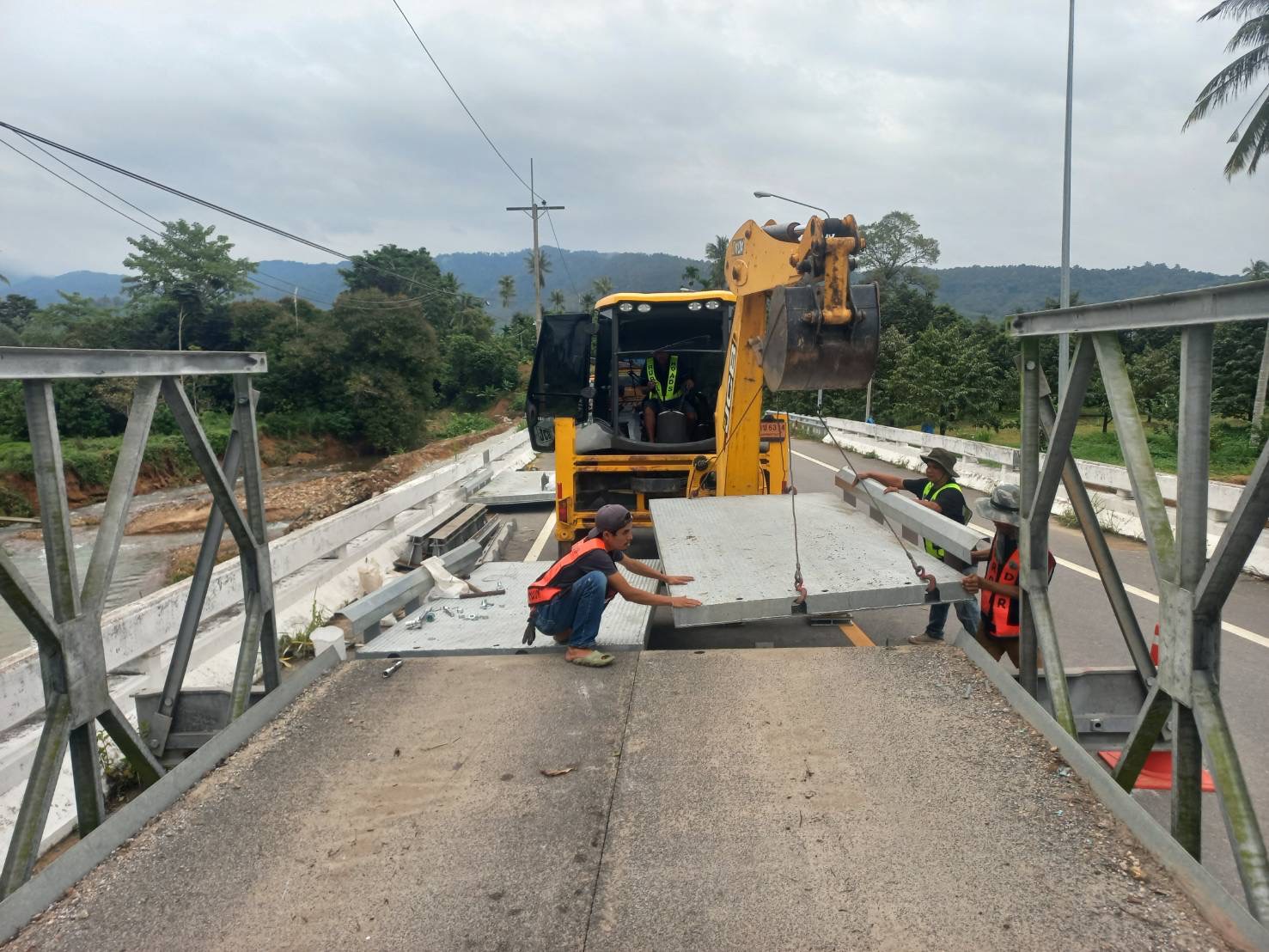 นอกจากนี้ ทช. ยังได้ระดมกำลังเจ้าหน้าที่เร่งทำการติดตั้งสะพานเบลีย์หรือสะพานเหล็กสำเร็จรูป บนถนนทางหลวงชนบทสายทาง นศ.4093 แยก ทล.4186 (กม.15+420) บ้านคลองนัน อำเภอนบพิตำ จังหวัดนครศรีธรรมราช เพื่อเป็นการบรรเทาความเดือดร้อนและช่วยเหลือประชาชนในพื้นที่อย่างเร่งด่วนอีกด้วย สำหรับในส่วนของสำนักงานทางหลวงชนบทที่ 12 (สงขลา) ได้สนับสนุนรถบรรทุกลากจูงในการขนย้ายรถสายพานอเนกประสงค์ของกองพลพัฒนาที่ 4 จังหวัดสงขลา เพื่อใช้ในการช่วยเหลือและขนส่งผู้ประสบภัยพื้นที่น้ำท่วมของจังหวัดสงขลา เพื่อช่วยบรรเทาทุกข์และอำนวยความสะดวกในการเดินทางในช่วงภาวะวิกฤตดังกล่าวอีกด้วย