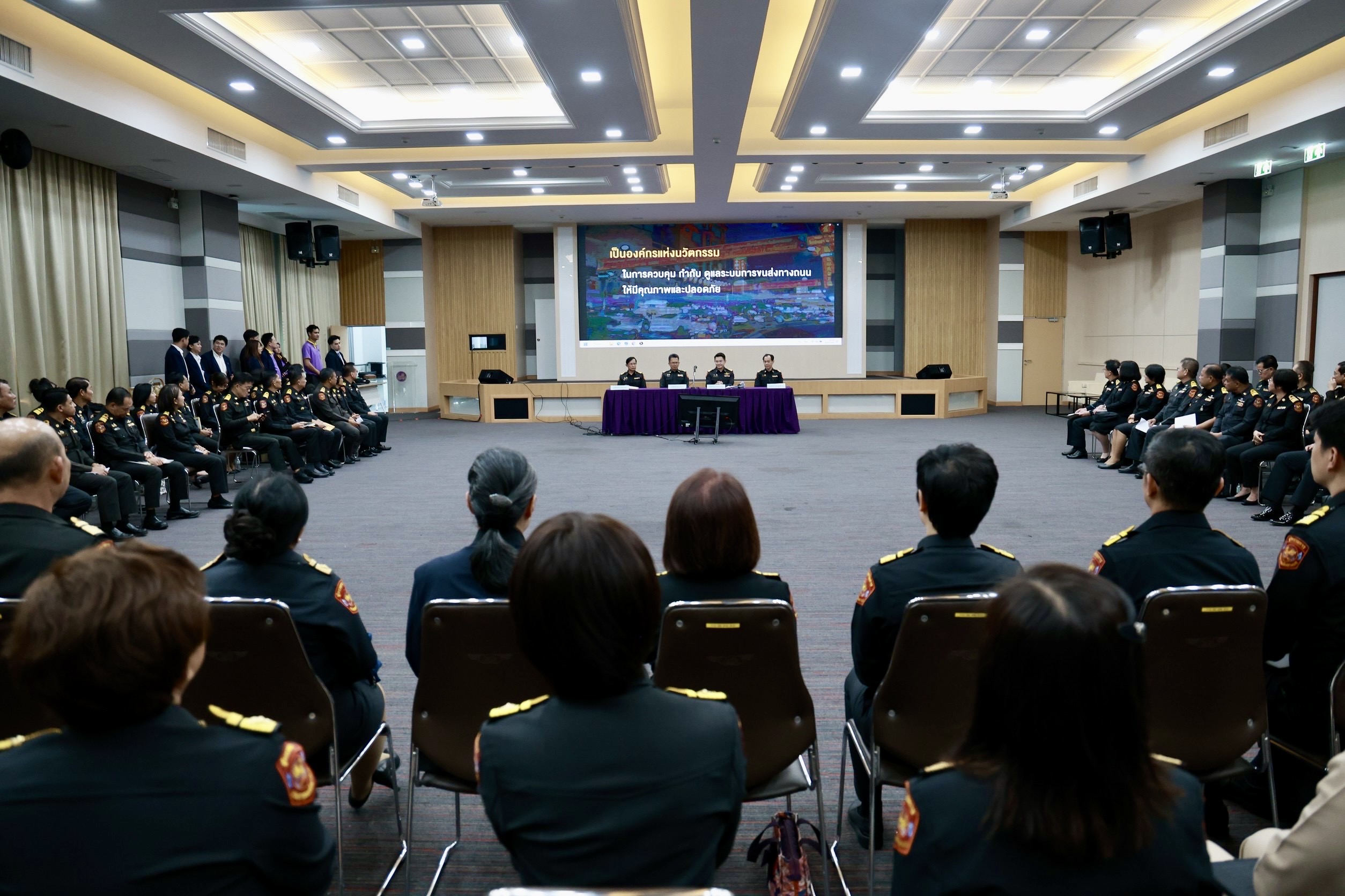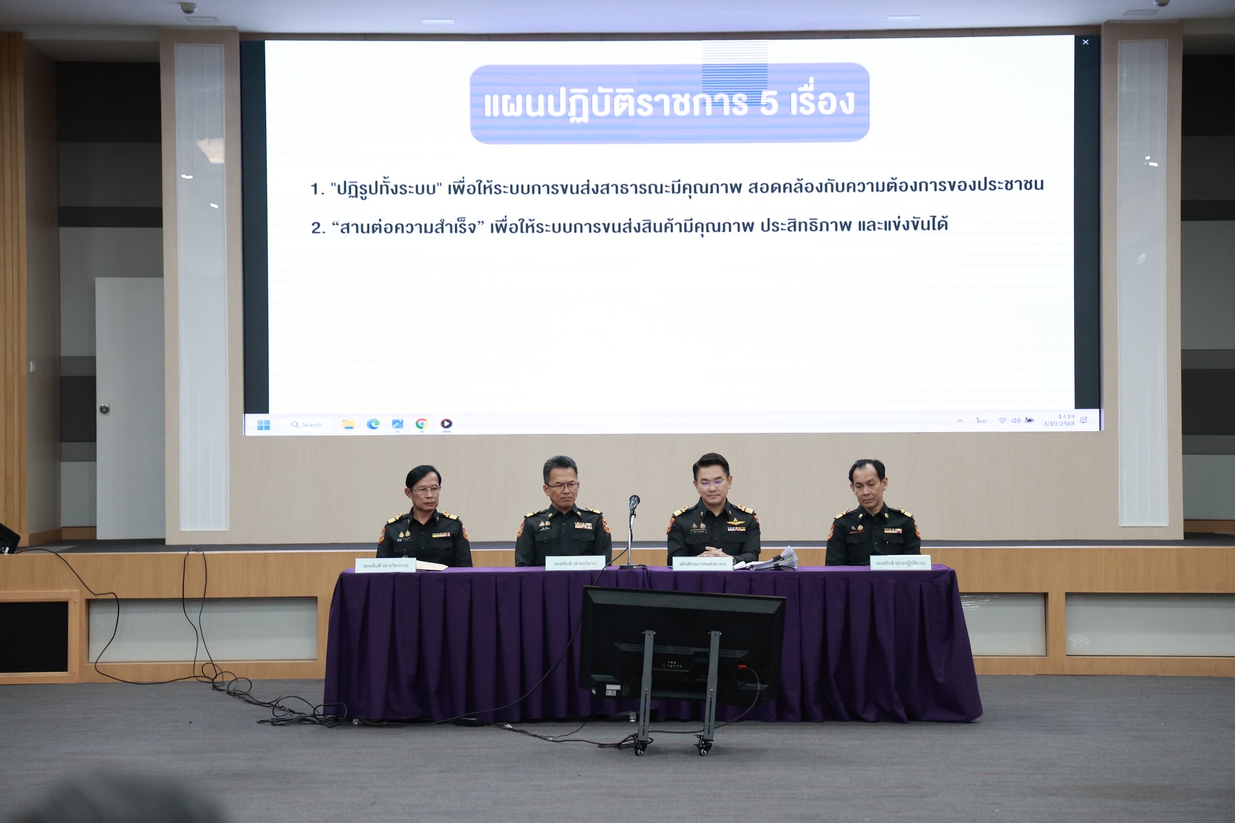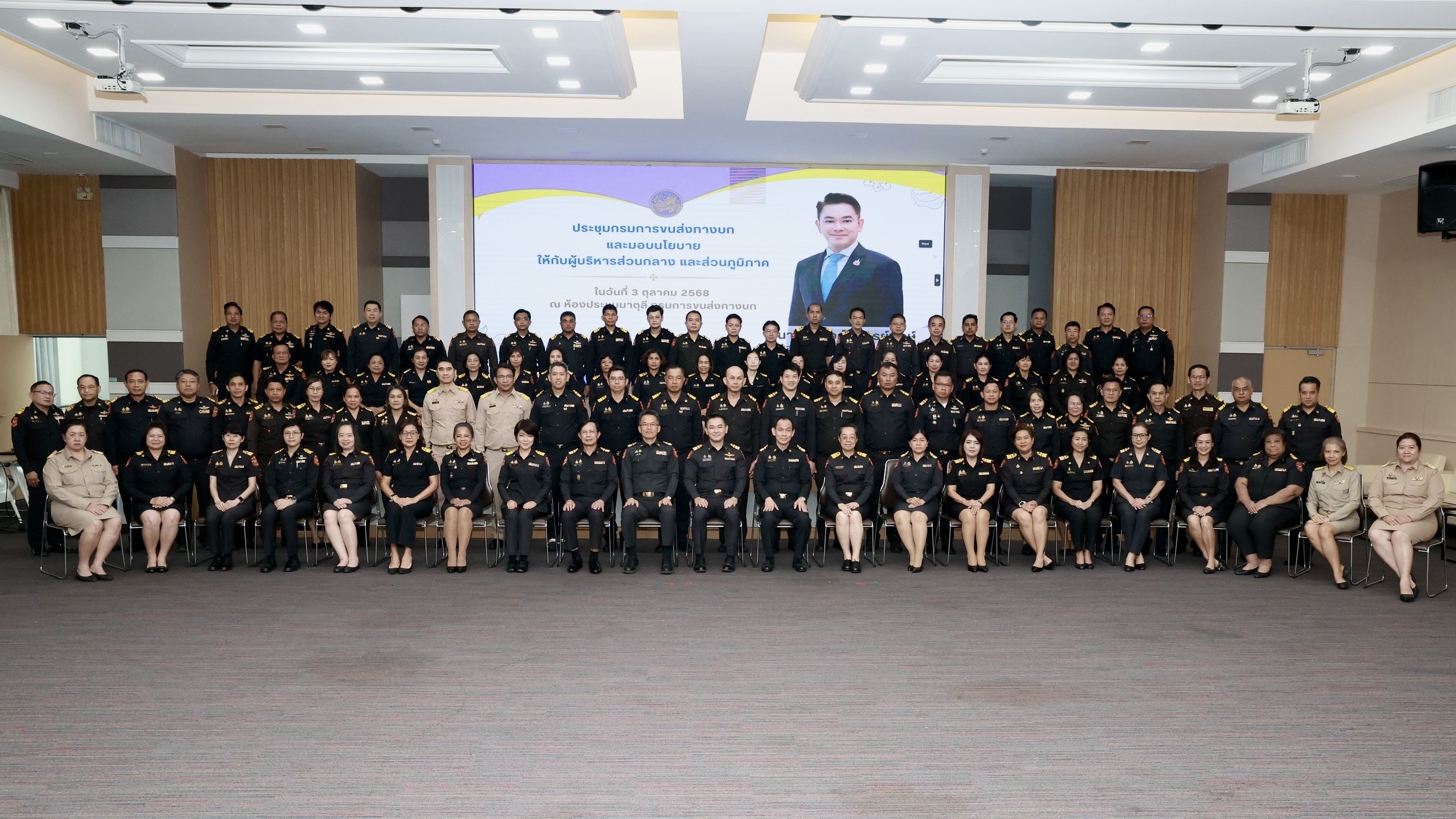 เมื่อวันที่ 3 ตุลาคม 2568 เวลา 13.00 น. ณ ห้องประชุมมาตุลี อาคาร 10 ชั้น 3 กรมการขนส่งทางบก นายสรพงศ์ ไพฑูรย์พงษ์ อธิบดีกรมการขนส่งทางบก เป็นประธานในการประชุมและมอบนโยบายการปฏิบัติราชการและแนวทางการขับเคลื่อนภารกิจสำคัญของกรมการขนส่งทางบก ภายใต้แนวคิด “ขับเคลื่อนขนส่งปลอดภัย มาตรฐานใหม่ ทันสมัยเพื่อประชาชน” โดยมีผู้บริหารส่วนกลาง ส่วนภูมิภาค ขนส่งจังหวัดทั่วประเทศเข้ารับมอบนโยบายดังกล่าว