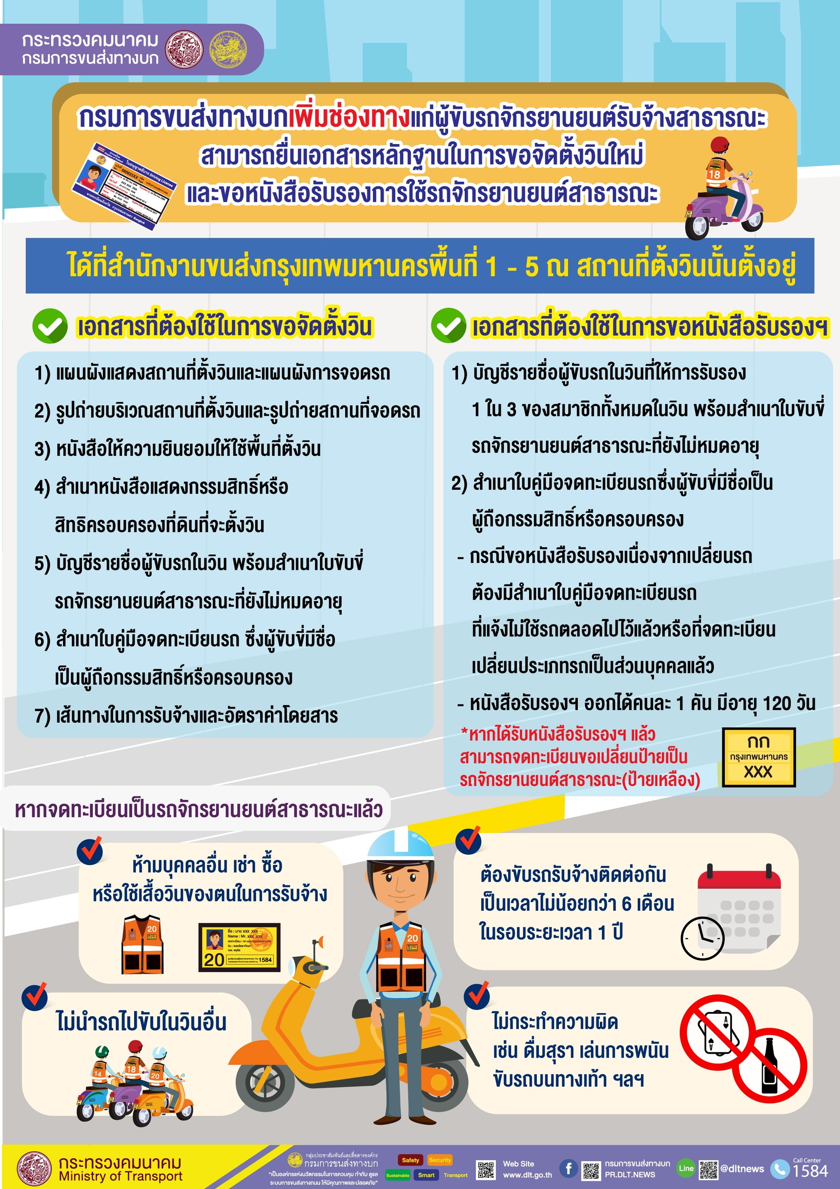 “กรมการขนส่งทางบก” อำนวยความสะดวกเพิ่มช่องทางแก่ผู้ขับรถจักรยานยนต์รับจ้างสาธารณะ สามารถยื่นเอกสารหลักฐานในการขอจัดตั้งวินใหม่ และขอหนังสือรับรองการใช้รถจักรยานยนต์สาธารณะเพื่อเป็นหลักฐานประกอบการจดทะเบียน (ป้ายเหลือง) ได้ที่สำนักงานขนส่งกรุงเทพมหานครพื้นที่ 1 -5 ณ สถานที่ตั้งวินนั้นตั้งอยู่ แนะประชาชนเลือกใช้บริการมอเตอร์ไซค์วินที่จดทะเบียนถูกต้องตามกฎหมายเพื่อความปลอดภัย และได้รับบริการที่เป็นธรรม