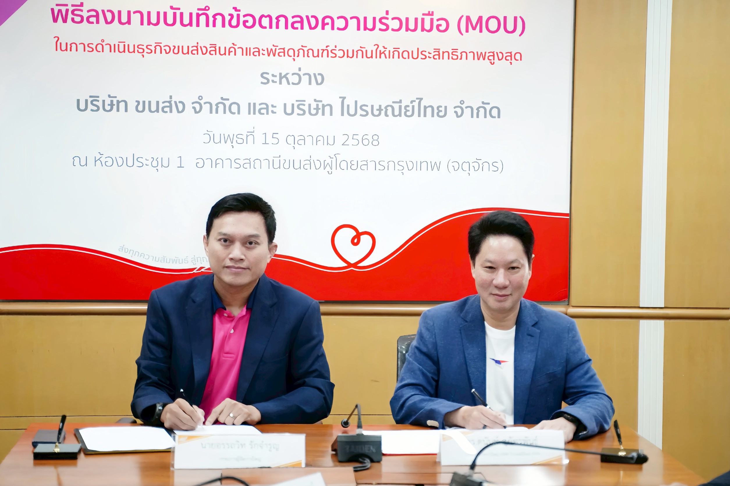 วันนี้ (15 ตุลาคม 2568) นายอรรถวิท รักจำรูญ กรรมการผู้จัดการใหญ่ บริษัท ขนส่ง จำกัด (บขส.) พร้อมด้วย ดร.ดนันท์ สุภัทรพันธุ์ กรรมการผู้จัดการใหญ่ บริษัท ไปรษณีย์ไทย จำกัด (ปณท) ร่วมลงนามบันทึกข้อตกลงความร่วมมือ (MOU) เพื่อร่วมกันพัฒนา ส่งเสริม สนับสนุนในการทำงานร่วมกัน เพิ่มประสิทธิภาพในการให้บริการประชาชนในการฝากส่งสินค้าและพัสดุภัณฑ์ โดยมีคณะผู้บริหารของทั้ง 2 หน่วยงานเข้าร่วมฯ ณ ห้องประชุม 1 ชั้น 4 อาคารสถานีขนส่งผู้โดยสารกรุงเทพ (จตุจักร)