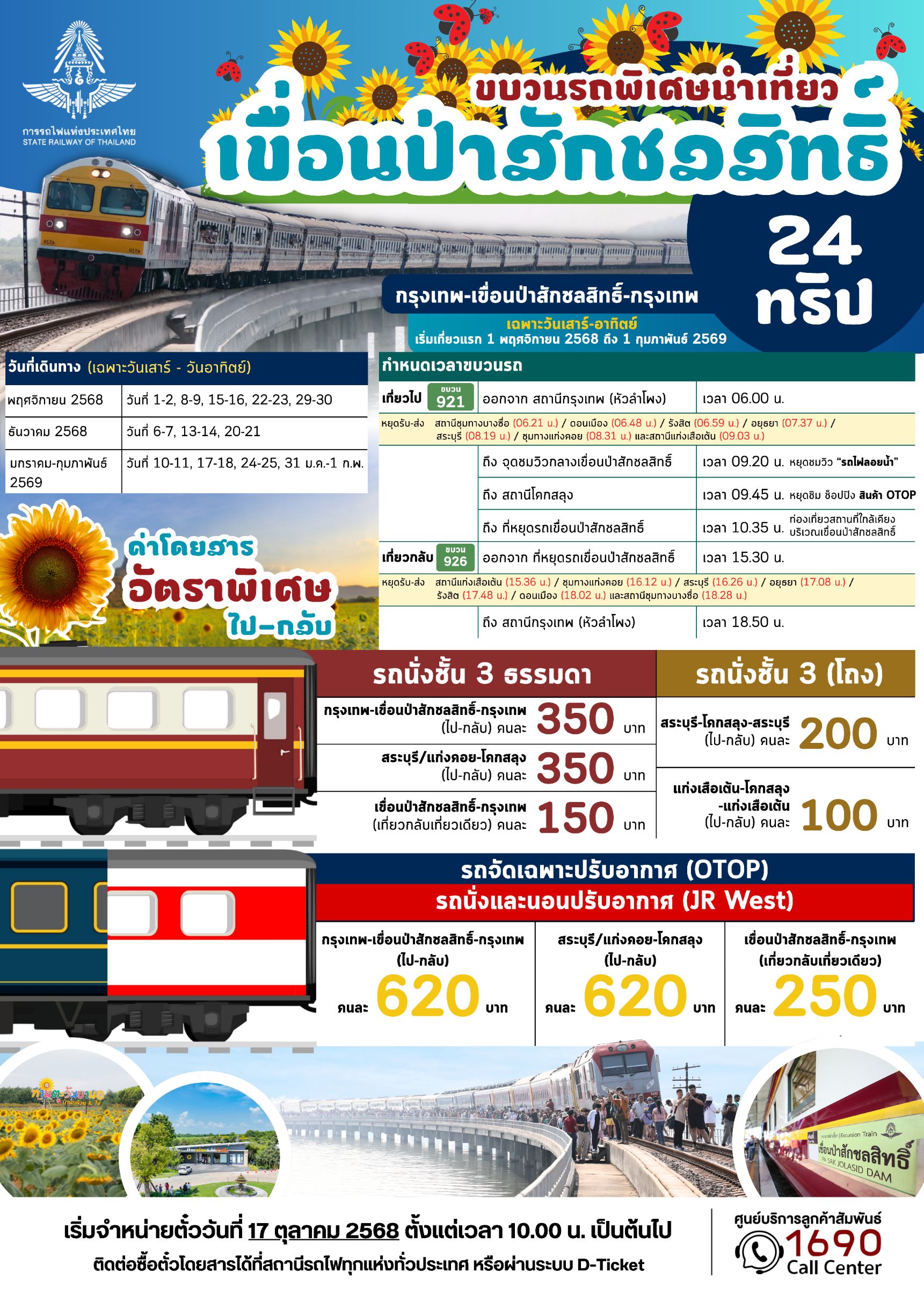 การรถไฟแห่งประเทศไทย (รฟท.) ขอเชิญชวนประชาชนและนักท่องเที่ยวร่วมสัมผัสประสบการณ์สุดพิเศษ “นั่งรถไฟลอยน้ำ รับลมหนาว ชมวิวกลางเขื่อน” กับขบวนรถพิเศษนำเที่ยว เส้นทาง กรุงเทพ (หัวลำโพง) – เขื่อนป่าสักชลสิทธิ์ – กรุงเทพ (หัวลำโพง) เส้นทางสุด Unseen ของเมืองไทย ที่จะพาผู้โดยสารนั่งรถไฟ “ลอย” เหนืออ่างเก็บน้ำ ชมทิวทัศน์สวยงามของธรรมชาติแบบ 360 องศา พร้อมเปิดจำหน่ายบัตรโดยสารพร้อมกันทั่วประเทศตั้งแต่วันที่ 17 ตุลาคม 2568 เวลา 10.00 น. เป็นต้นไป