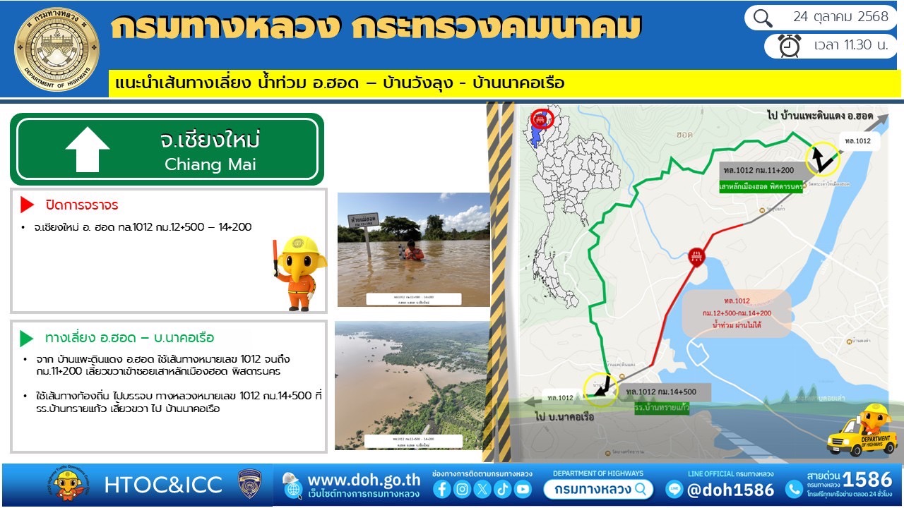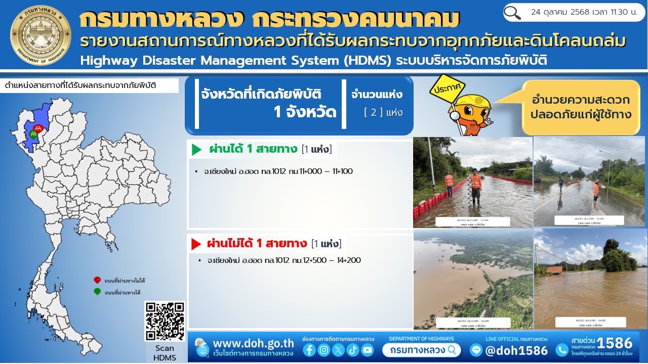 กรมทางหลวง (ทล.) กระทรวงคมนาคม ระบุว่า วันนี้ (24 ต.ค.2568) ได้สรุปสถานการณ์ล่าสุด พบการจราจรผ่านไม่ได้ในพื้นที่จังหวัดเชียงใหม่ ดังนี้