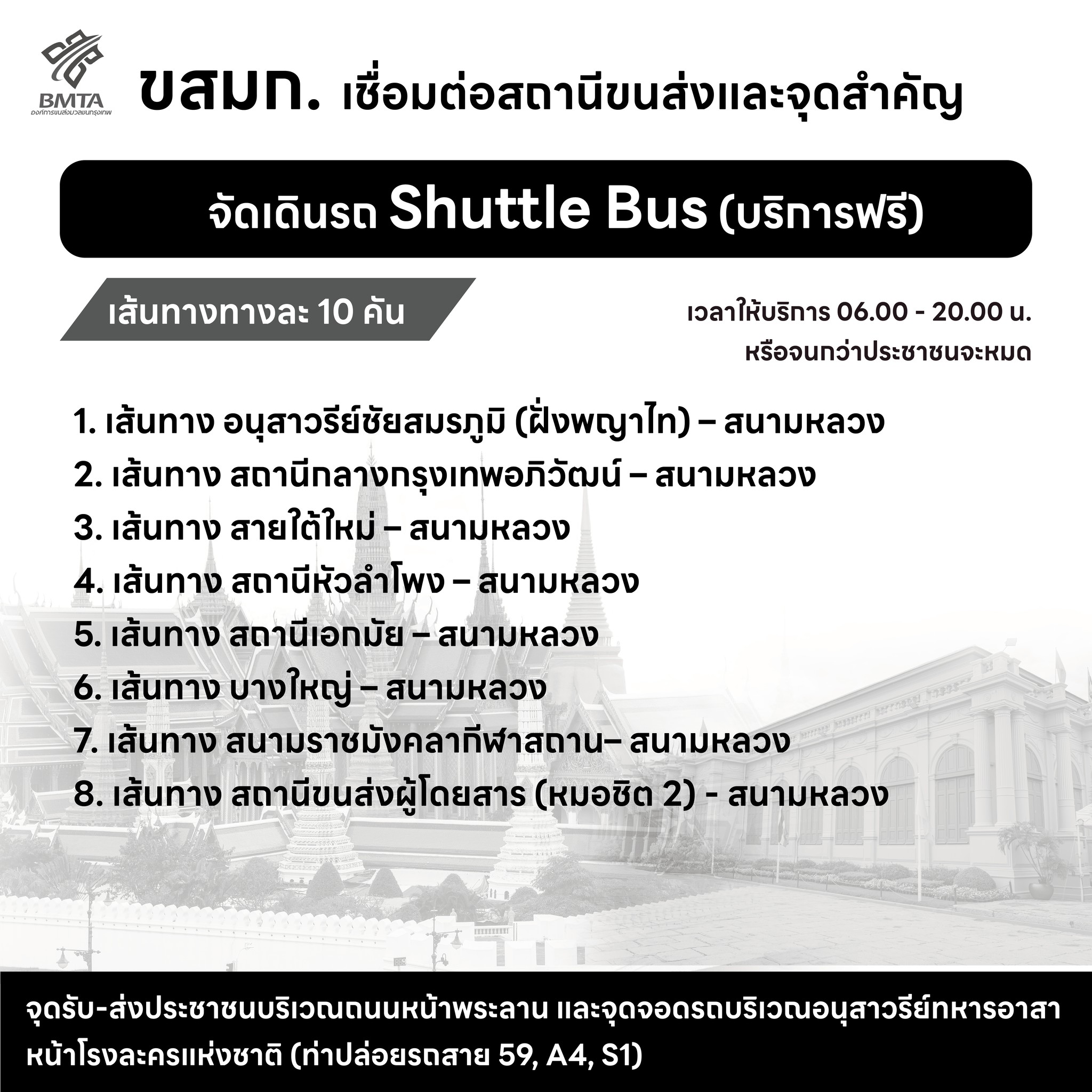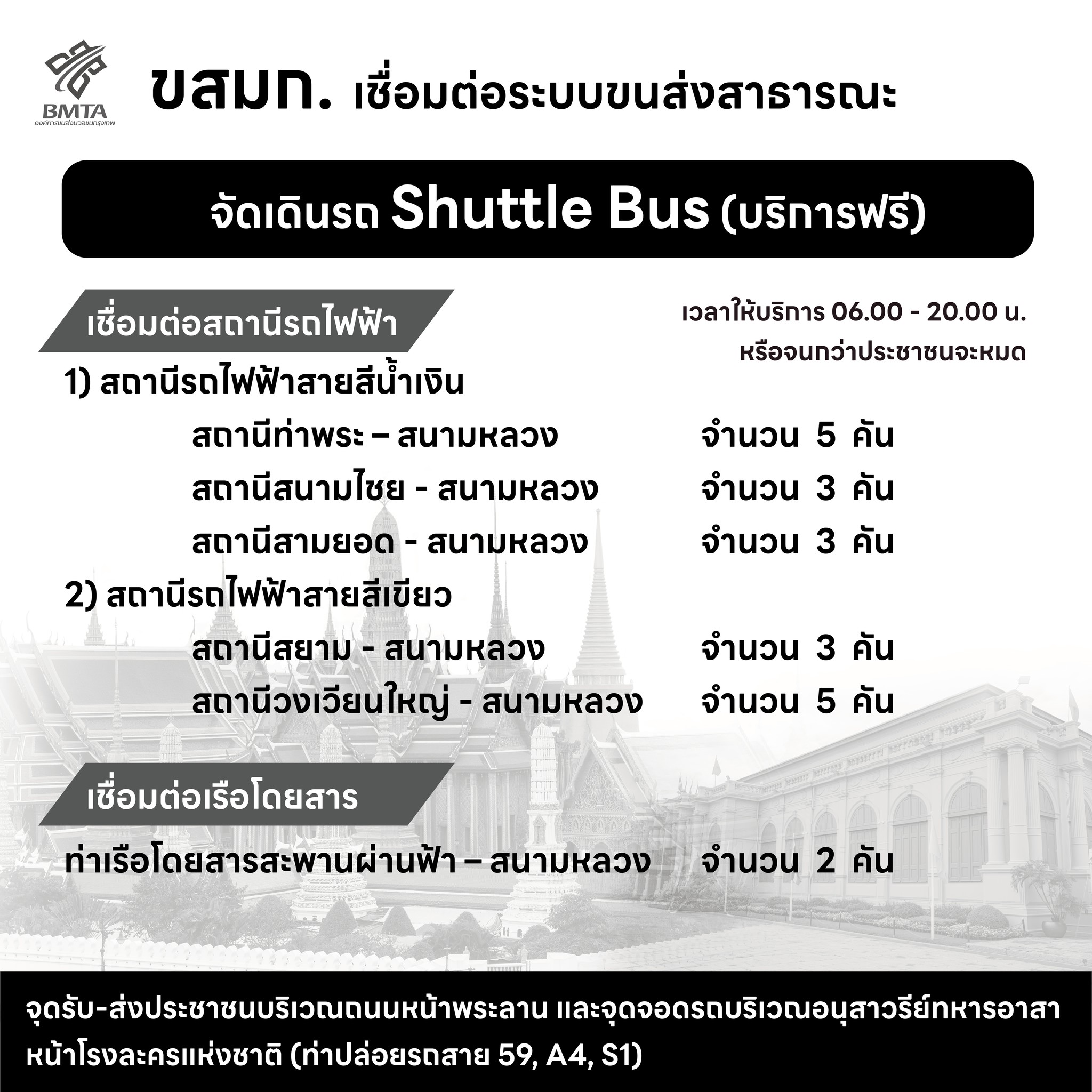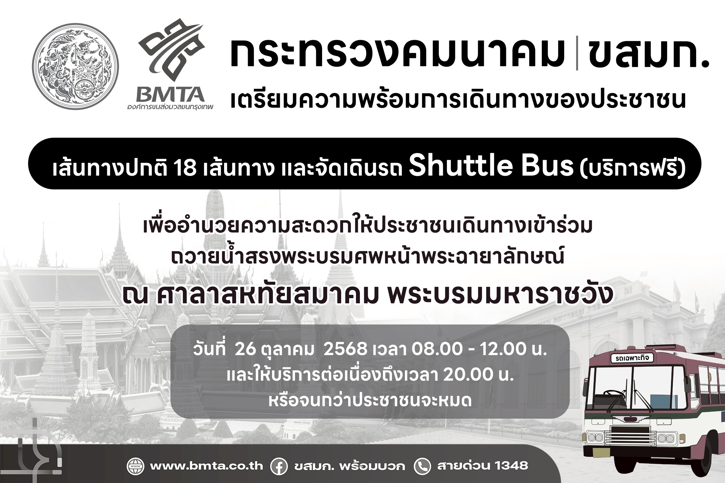 องค์การขนส่งมวลชนกรุงเทพ (ขสมก.) ระบุว่า เพื่ออำนวยความสะดวกแก่ประชาชนในการเดินทาง ขสมก. ได้จัดเดินรถในเส้นทางปกติ 18 เส้นทาง รถโดยสาร Shuttle Bus (บริการฟรี) เชื่อมต่อสถานีรถไฟฟ้า จำนวน 6 เส้นทาง และ เชื่อมต่อสถานีขนส่ง จำนวน 8 เส้นทาง ให้บริการในวันที่ 26 ตุลาคม 2568 ตั้งแต่เวลา 08.00 – 12.00 น. และให้บริการต่อเนื่องจนถึงเวลา 20.00 น. หรือจนกว่าประชาชนจะออกจากพื้นที่จนหมด